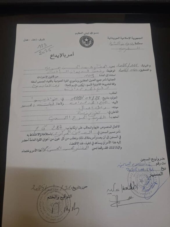 ومثُل ولد صدافه اليوم أمام النيابة العامة بعد توقيفه إثر اعتدائه على الإعلامي حنفي ولد دهاه ليلة الإثنين الماضي.