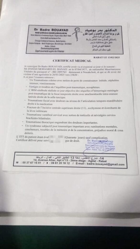كشف تقرير طبي صادر عن جراح الأعصاب المعتمد لدى المحاكم المغربية، الدكتور بدر بوعياد، أن الصحفي حنفي ولد دهاه تعرض لإصابات خطيرة، من بينها ارتجاج في الدماغ، وصدمات على مستوى الوجه والصدر والعمود الفقري، إضافة إلى اضطرابات في التوازن والذاكرة، وذلك إثر اعتداء تعرض له مؤخرا في نواكشوط.